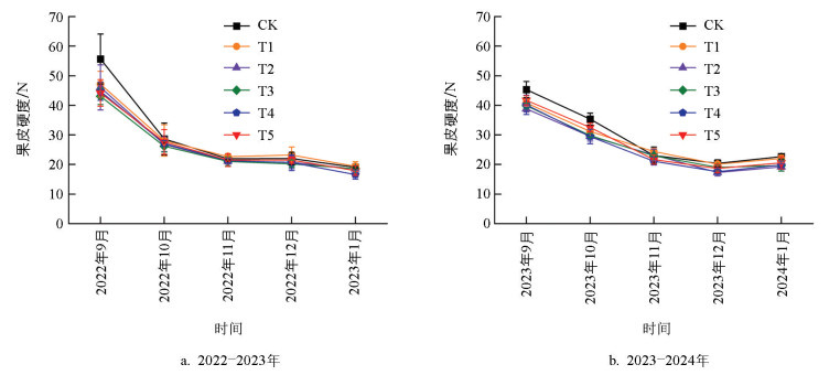 从9月至翌年1月沃柑果皮硬度监测结果表明(图 3),2023年9月至10月果皮硬度迅速降低,10月至12月缓慢降低至平稳,至2023年1月采收时又略有降低;2023年1月果实成熟采收时各处理果皮硬度为16.63~19.44 N,其中T4处理最小,T1处理最大,T4比T1处理显著降低了14.5%。2023年9月至11月果皮硬度快速降低,11月至12月缓慢降低,至2024年1月采收时又略有升高;2024年1月果实成熟采收时各处理果皮硬度为19.21~22.69 N,以T2处理相对最小,CK处理最大,T2比CK处理显著降低了15.4%。