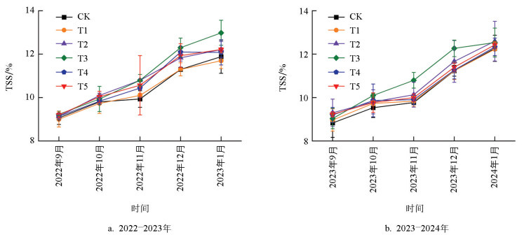 从9月至翌年1月沃柑果实TSS含量检测结果表明(图 4),2022年9月至11月果实TSS含量缓慢升高,11月至12月快速升高,12月至翌年1月缓慢升高至最大值。2023年1月采收时,T3处理的果实TSS含量最大,为12.98%;T1处理最小,为11.70%;T3比T1处理显著提高了11.0%。2024年9月至11月果实TSS含量缓慢升高,11月至翌年1月快速升高至最大值。2023年12月各处理的果实TSS含量,以T3处理相对最高,为12.27%;CK和T1处理最小,为11.23%;T3处理比CK、T1处理均显著增加了9.2%。2024年1月采收时,T2处理的TSS含量最大,比CK处理提高了2.7%,但差异未达显著水平。