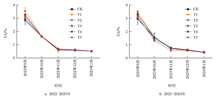 从9月至翌年1月沃柑果实TA含量检测结果表明(图 5),两年试验的动态变化规律一致,即9月至11月果实TA含量快速下降,11月至翌年1月缓慢下降,至采收时达相对最低。2023年1月采收时,T3和T4处理的果实TA含量最小,为0.51%;T1处理最大,为0.54%;T3和T4分别比T1处理降低了5.0%、5.0%,但各处理间无显著性差异。2023年12月,T5处理的果实TA含量相对最小,为0.56%;CK处理最大,为0.62%;T5比CK处理显著降低了10.1%。2024年1月采收时,T3处理的果实TA含量最小,为0.41%,T3比CK处理降低了11.8%,但各处理间无显著差异。
