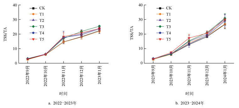 从9月至翌年1月沃柑果实TSS/TA检测结果表明(图 6),2022年9月至10月沃柑果实TSS/TA缓慢升高,10月至11月快速升高,11月至翌年1月缓慢升高至最大值。2023年1月采收时,T3处理的TSS/TA最大,为25.42;T1处理最小,为21.87;T3比TI显著提高了16.2%。2023年9月至10月沃柑果实TSS/TA缓慢升高,10月至翌年1月快速升高至最大值。2023年12月,T3处理的果实TSS/TA最大,为21.02;CK处理最小,为18.20;T3处理比CK显著增加了15.5%。2024年1月采收时,T3处理的TSS/TA最大,为30.94,但各处理间差异不显著。