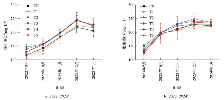 从9月至翌年1月沃柑果实VC含量检测结果表明(图 7),2022年9月至10月沃柑果实VC含量缓慢升高,10月至12月快速升高至最高值,至2023年1月采收时有所降低。2023年1月采收时,T3处理的果实VC含量最大,为227.6 mg/L;CK处理最小,为205.3 mg/L;T3比CK提高10.9%,但不存在显著性差异。2023年9月至10月沃柑果实VC含量迅速升高,10月至12月缓慢升高至最高值,至2024年1月采收时有所下降。2024年1月采收时,T4处理的果实VC含量最大,为236.6 mg/L;T1处理最小,为221.8 mg/L;T4与T1处理差异显著。