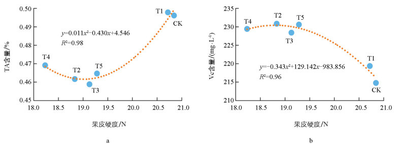 将2023年和2024年1月中旬果实成熟采收期各处理指标的数据取平均值,通过多项式拟合,探究果皮硬度、果皮厚度分别与果实TSS、TA、VC含量之间的相关性。数据分析结果表明,果皮硬度与果实TA含量、果实VC含量之间存在显著的相关性,呈现出较高的曲线拟合度(R2>0.8)。从图 8a可知,果皮硬度与TA含量呈正相关,其变化趋势在T3处理时出现转折。从图 8b可见,果皮硬度与VC含量呈负相关,于T2处理时发生明显转折。由上可见,当果实变软时,TA下降,VC升高。各碱性土改良施肥处理均能有效提高沃柑果实外观内质。