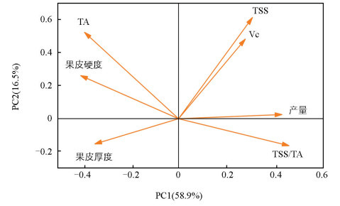 各碱性土改良施肥处理产量及品质指标两年平均值的主成分分析载荷图表明(图 9),主成分1和主成分2贡献率分别为58.9%、16.5%,累计贡献率达75.4%,主成分1中起决定作用的指标有产量、果皮厚度、果皮硬度、TSS/TA,主成分2主要由TSS、TA、VC含量决定。