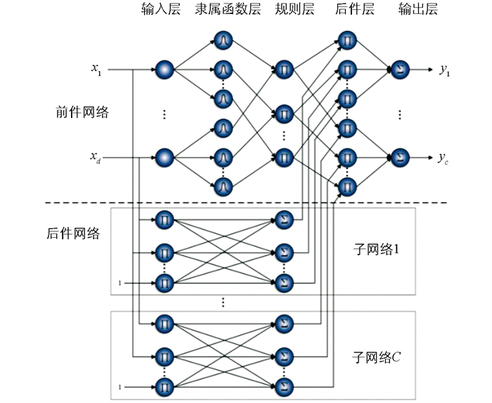 • TS模糊模型框架如图 1所示,主要包括前件网络和后件网络2部分。模型从输入到输出划分为5层,其中后件层由前件参数和后件参数共同构成[11-12]。TS模糊模型的数学描述如下: