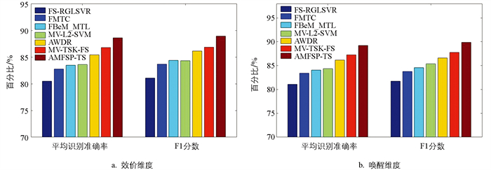 图 2分别展示了对比方法在效价和唤醒2个维度的平均识别准确率和F1分数。从图 2可以看出,AMFSP-TS模型在效价和唤醒2个维度的平均识别准确率分别达到88.60%和89.23%,较基线模糊模型FS-RGLSVR分别提高了8.81%和9.16%,较次好方法分别提高了1.96%和1.95%。AMFSP-TS模型在后件参数学习中通过低秩约束和稀疏约束保留多频带数据的一致性和互补性,通过自适应权重平衡各频带在情感识别中的作用。针对EEG多频带数据的关联性和差异性,AMFSP-TS模型在后件参数学习中融入频带特征的全局结构和局部结构信息。另外,AMFSP-TS模型将模糊空间的相似性矩阵视为一个未知变量而非使用常规的近邻策略,进一步挖掘频带中有价值的信息,因此AMFSP-TS模型具有较强的泛化学习能力。而FMTC方法通过粒度计算,每个类都被视为一个信息颗粒,每个类的识别任务独立进行,多频带EEG数据间的联系和差异不能得到充分挖掘;FBeM_MTL方法融合了进化学习、多任务学习和模糊模型,并转化为线性回归模型,也无法挖掘隐含在多频带EEG数据间的内在联系;MV-TSK-FS方法使用多视图框架协同处理多频带EEG数据,仅简单地通过二次正则化视图加权机制来区分每个频带的重要性;AWDR方法将原始特征的级联映射到有判别力的低维子空间来融合多频带EEG数据;MV-L2-SVM方法则将多频带EEG数据投影到高维核空间,无法考虑EEG数据的结构信息。