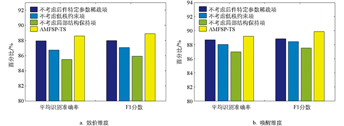 图 3分别展示了DEAP数据集上效价和唤醒2个维度的平均识别准确率和F1分数。从图 3中可以看出,AMFSP-TS模型不考虑后件特定参数稀疏项时的平均识别准确率和F1分数在效价维度分别下降了0.98%和0.99%,在唤醒维度分别下降了0.51%和1.00%,说明后件特定参数稀疏项用来保留每个EEG频带在后件参数学习中的独特作用是有效的。AMFSP-TS模型不考虑低秩约束项时的平均识别准确率和F1分数在效价维度分别下降了1.95%和1.84%,在唤醒维度分别下降了1.17%和1.49%,说明低秩约束项确实能起到保留数据全局结构的作用。AMFSP-TS模型不考虑局部结构保持项时的平均识别准确率和F1分数在效价维度分别下降了3.11%和2.98%,在唤醒维度分别下降了2.22%和2.32%,说明保持局部结构也很重要,有助于模型更深层次地挖掘EEG的隐含信息。