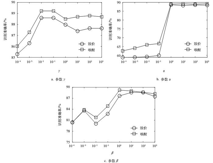 接着从参数敏感性分析AMFSP-TS模型的性质。需要寻优的参数包括正则化项‖ W(ν)F2的参数γ、后件特定参数稀疏项‖E(ν)2,1的参数α和低秩约束rank(Θ)的参数β。正则化项‖ S(ν)F2的参数λ可由式(25)直接求得。图 5展示了受试者1~10在效价和唤醒维度上的识别准确率平均值。从图 5a可以看出,不同的γ值会导致AMFSP-TS模型性能的变化,但总体在小范围内浮动。实验发现其他受试者上也有类似的结果。参数α控制矩阵E(ν)的行稀疏,α值越大,E(ν)越稀疏。从图 5b可以看出,当α>1时,AMFSP-TS模型在效价和唤醒维度上的识别准确率较高。低秩约束项在模型中起到保留数据全局结构的作用,从图 5c可以看出,当参数β较小时,AMFSP-TS模型在效价和唤醒维度上的识别准确率都较低;当β>1后,模型的性能趋于稳定并达到较高的识别准确率。