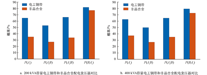通过数据分析可知,目前无论是200 kVA容量还是400 kVA容量的配电变压器,电工钢带铁心的采用率都比非晶合金铁心高。采用非晶合金铁心的P(AiB)值比电工钢带铁心低,表明非晶合金铁心自身采用率较低。采用非晶合金铁心的P(Ai|B)值比电工钢带铁心低,表明采用非晶合金铁心合格的数量占所有合格变压器数量的比例低,隐含着当前生产企业对电工钢带铁心在提高短路合格率上的表现达成共识。采用非晶合金铁心的P(B|Ai)值比电工钢带铁心低,表明非晶合金铁心对变压器抗短路能力可能产生负面影响。从相关系数也可以看出电工钢带铁心与变压器的合格率提升呈正相关。目前,非晶合金铁心变压器还不够成熟,抗短路特性仍有较大的提升空间。