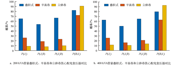 通过数据分析可知,无论是200 kVA容量还是400 kVA容量的配电变压器,叠积式铁心的采用率都比平面卷铁心和立体卷铁心高。采用立体卷铁心的P(AiB)值比叠积式铁心和平面卷铁心低,表明变压器中采用立体卷铁心的合格数量占所有变压器数量的比例最低。立体卷铁心的P(B|Ai)值比叠积式铁心和平面卷铁心高,表明立体卷铁心对变压器抗短路能力会产生正面影响;而平面卷铁心的P(B|Ai)值最低,表明平面卷铁心对变压器抗短路能力会产生负面影响。叠积式铁心的P(Ai|B)值比平面卷铁心和立体卷铁心高,表明当前生产企业认为叠积式铁心技术相对更成熟。从相关系数也可以看出叠积式铁心和立体卷铁心与变压器的合格率提升呈正相关。由于成本的原因,目前立体卷铁心变压器的采用率较低,但其合格率高于叠积式铁心和平面卷铁心变压器,未来采用立体卷铁心结构有望显著提高变压器短路承受能力试验的合格率。
