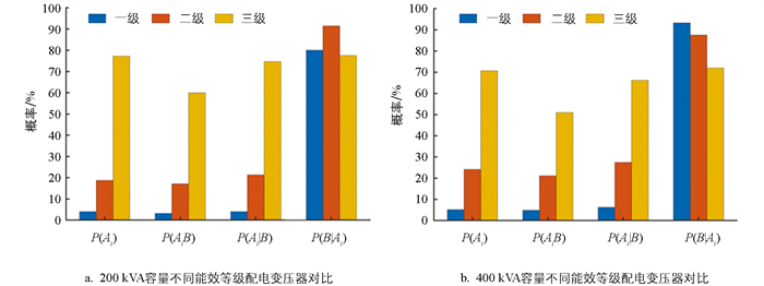 目前,无论是200 kVA容量还是400 kVA容量的配电变压器,三级能效的采用率最高,其次是二级能效,一级能效采用率最低。一级能效配电变压器P(AiB)值最低,表明变压器中采用一级能效合格的数量占所有变压器数量的比例低。200 kVA配电变压器中二级能效的P(B|Ai)值最高,400 kVA配电变压器中一级能效的P(B|Ai)值最高,表明一级能效、二级能效的变压器在设计、制造和材料选择方面更加优越,具有更好的电气性能和结构强度,不仅在能效上表现更好,还在抗短路方面具备更高的可靠性。三级能效配电变压器的P(Ai|B)值最高,表明当前生产企业认为三级能效变压器技术相对更成熟,更愿意采用三级能效配电变压器。从相关系数可以看出,无论是200 kVA容量还是400 kVA容量的配电变压器,二级能效配电变压器与短路合格率提升的相关性最高。目前,二级能效配电变压器的采用率介于一级能效和三级能效变压器之间,相比三级能效变压器合格率更高,相比一级能效变压器产品成熟度更高。随着二级能效和一级能效配电变压器的采购规模加大,将会对变压器短路承受能力试验合格率带来较大提升。