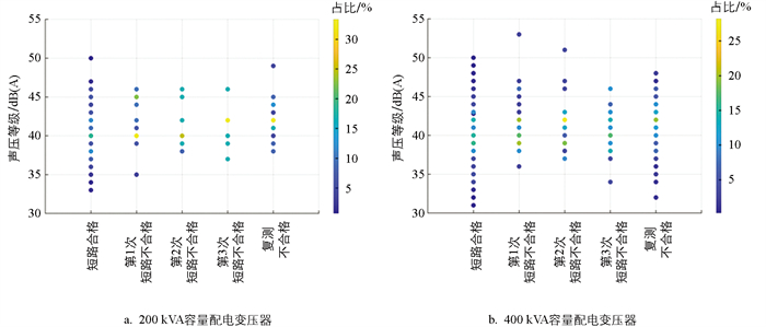 配电变压器的振动和噪声问题日益凸显,其与配电变压器的抗短路能力也存在一定关系。对抽检的变压器声压等级检测数据按短路合格、第1次短路承受能力试验不合格、第2次短路承受能力试验不合格、第3次短路承受能力试验不合格和复测不合格进行对比分析。200 kVA和400 kVA配电变压器声压等级与抗短路特性的关系如图 4所示,颜色深浅代表该声级变压器的占比。由统计结果可知,无论是200 kVA变压器还是400 kVA变压器,第1次、第2次、第3次短路承受能力试验不合格的配电变压器相比短路合格的变压器,其声压等级更集中在较高的区域,复测不合格的变压器声压等级则较为分散。通过比较可知,配电变压器的声级特性和抗短路特性之间存在一定关系,但并不直接影响。变压器的抗短路能力主要与绕组、绝缘、铁心等有关,而声级特性与变压器的设计、结构、材料等有关。在设计变压器时,需要综合考虑抗短路能力、噪声水平以及其他性能指标。通过合理的设计、材料选择和工艺措施,可以在保证抗短路能力的前提下,尽可能降低噪声水平。变压器抗短路能力和声级特性是需要综合考虑的因素,生产企业在设计和制造过程中应平衡这些因素,以满足电网的要求和用户的需求。