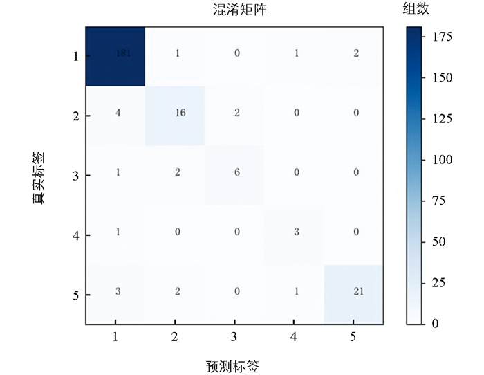 经过训练得到朴素贝叶斯分类算法模型,为验证模型的合理性,再对后20%数据作为测试样本集进行类别预测。利用朴素贝叶斯分类后验概率最大原则进行判别,基于待验样本的特征属性数据快速预测每台变压器的抗短路特性,并与真实等级进行类比,得到待验样本预测类别正确的为227组,错误的为20组,分类总体准确率为91.90%。具体的朴素贝叶斯分类结果如表 10和图 6所示,其中混淆矩阵表明模型对多数类别标签的预测较为准确,但仍存在少量类别标签预测错误的情况。