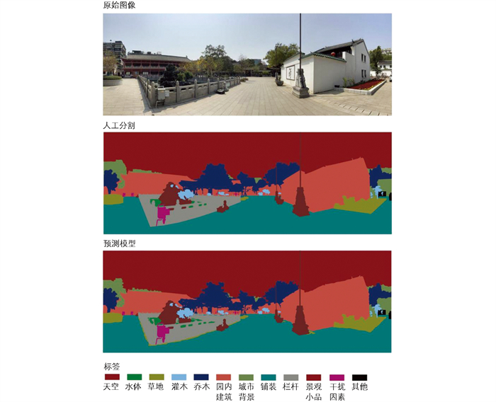 • DeepLabv3+模型网络架构主要由编码和解码器构成,编码器提取多尺度特征,解码器恢复目标边界细节,可精准、有效与快速捕捉景观信息,将图像细分成不同语义单元,实现景观分割[27]。佛寺园林景观构成要素较多,而该模型公开数据集主要包含城市街景,难以满足分割需求。因此,本研究基于DeepLabv3+训练一种适用于佛寺园林景观语义分割的模型,能够为提升景观识别精度。具体训练过程为:①建构佛寺园林景观要素专属数据集。选取70张佛寺园林景观要素较为丰富的代表性全景图像,确保图像具有多样性,再借助Labelme软件,对80张代表图像进行像素级标注,类别标签如佛寺建筑、佛塔、园林植物、道路和水系等,将佛寺园林景观标签划分为12种类型(图 2),建构数据库。②语义分割模型的训练。基于DeepLabv3+网络架构,选取90张全景图像作为训练数据集,对其剪裁与缩放,再进行归一化处理;选取10张全景图像作为测试数据集,反复训练200次,确定模型超参数MPA和MIoU等评价指标,检验分割边界是否清晰。③预测结果检验和语义分割。经检验,训练后模型的平均像素准确率(MPA)为85.9%,平均交并比(MIoU)77.2%,分割性能好,精度高,满足佛寺园林景观要素分割实验要求,基于佛寺园林景观要素专属数据集,借助训练后的模型对116张佛寺园林全景图像进行语义分割。
