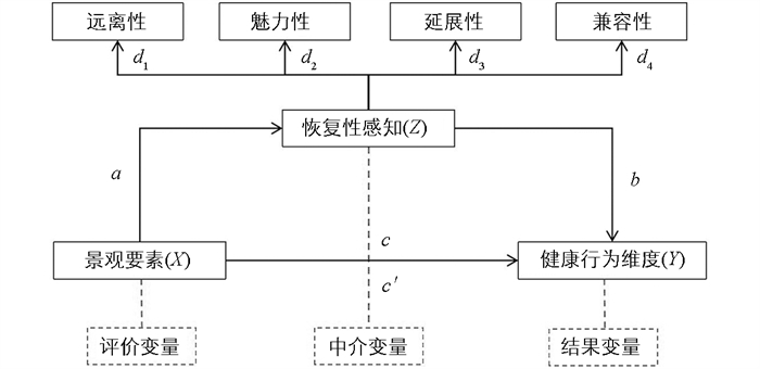 • ① 景观要素量化结果的归一化处理。为确保各项视觉景观要素的可比性和一致性,借助min-max方法对佛寺园林景观要素量化结果做归一化处理。②显著要素筛选与影响效果评估。自变量设置为佛寺园林景观27个要素,因变量分别设置为恢复性感知与公众健康行为量化结果,通过SPSS 22.0软件建立多元回归模型,将显著影响公众健康的佛寺园林景观要素进行筛选,再依据标准化回归系数(β)评估影响程度。③恢复性感知与健康行为关系的检验。采用皮尔逊相关分分析法,显著水平设置为0.05,检验远离性、魅力性、延展性和兼容性4个恢复性感知维度与恢复活动、体力活动、社交活动3种公众健康行为的关系。④中介模型建构与中介效应检验。将显著相关的佛寺园林景观要素视为自变量,恢复性感知视为中介变量,公众健康行为视为结果变量,建构佛寺园林景观要素对公众健康行为影响的中介效应模型(图 3),分别检验自变量、中介变量对3种公众健康行为的作用机制。运用AMOS 24.0平台bootstrap法,通过定义评估的方式对中介效应内路径系数的显著性进行检验。