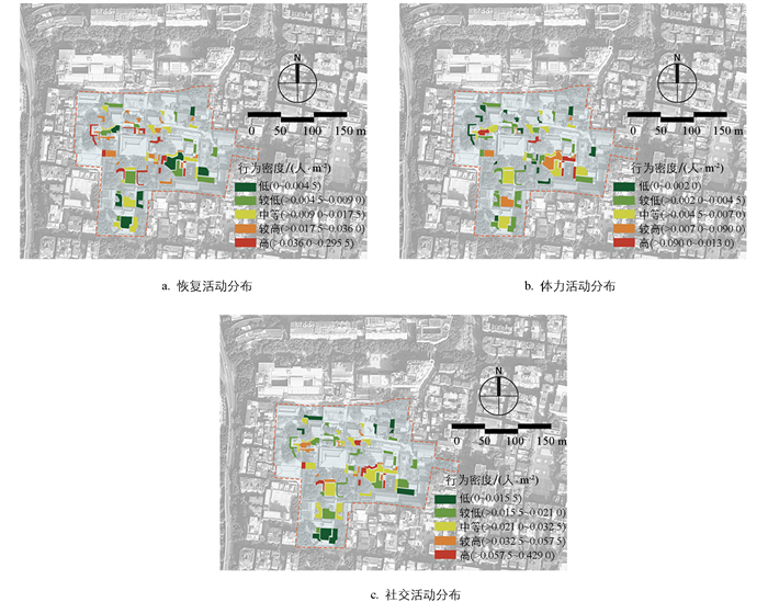 • 本研究运用行为观测法,于光孝寺5类功能分区43个景观节点进行观测,经统计,收集恢复活动、体力活动和社交活动分别为371、152、586人次。为更直观揭示3类健康行为人次分布格局,对其重分类与可视化,获得公众行为密度分布情况(图 4)。结果显示,社交活动人次最多,集中于围合性较好的小型景观节点;体力活动人次最少,多分布于具有开放性的广场和滨水空间;恢复活动人数居中,主要聚焦于植物层次丰富、花卉景观旖旎的节点。通过对比分析发现,3类公众健康行为存在显著的空间异质性。