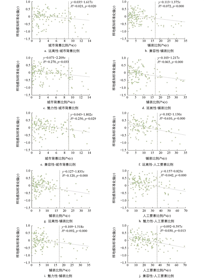 进一步分析表 3显示,佛寺园林人工景观要素占比对公众恢复性感知存在较显著的负向影响,通过城市背景比例(A1)、铺装比例(A4)与4个感知维度的散点拟合图发现(图 5),三者均对公众恢复性感知具有负向影响,且显著性存在阈值范围。当公众视野中城市背景(A1)、铺装比例(A4)和人工景观要素的阈值分别大于9%、17%和36%时,负向影响开始显著。依据模型参数发现,4个公众感知维度中,延展性的R2(模型拟合度)最低,可能是因为延展性感知强调景观要素的和谐统一,而佛寺园林景观要素多遵循佛教规制(轴对称布局、等级分明),从而强调佛教仪轨的严肃性。
