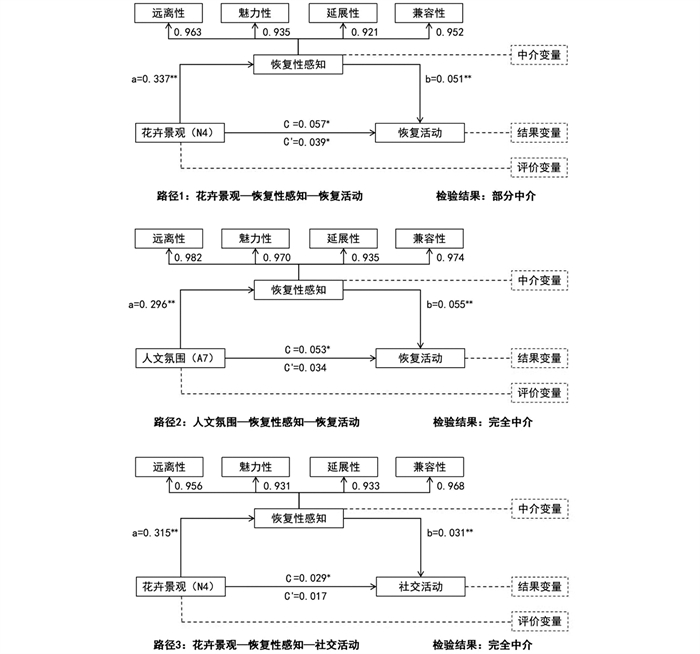 通过构建恢复性感知中介模型,并运用Bootstrap中介效应检验法对其中介效应进行检验,结果显示,恢复性感知中介效应显著的路径共有3条(图 6),具体表现为完全中介和部分中介作用2种类型。其中,路径2:“人文氛围(A7)—恢复性感知—恢复活动”,与路径3:“花卉景观(N4)—恢复性感知—社交活动”,两条路径的直接效应(C')分别为0.034、0.017,二者显著性p值均大于0.05,路径2与路径3的间接效应(a×b)分别为0.016、0.010,二者显著性p值分别小于0.01、0.05,反映出人文氛围(A7)和花卉景观(N4)主要通过影响公众恢复性感知来影响恢复活动和社交活动,而没有直接的效应,说明恢复性感知在佛寺园林景观要素对公众健康行为影响的中介效应模型中表现为完全中介作用;路径1:“花卉景观(N4)—恢复性感知—恢复活动”,其直接效应(C')是0.039,间接效应(a×b)是0.17,显著性p值均小于0.05,表明花卉景观(N4)不仅直接影响恢复活动,而且可以间接通过恢复性感知影响恢复活动,说明恢复性感知在佛寺园林景观要素对公众健康行为影响的中介效应模型中表现为部分中介作用。