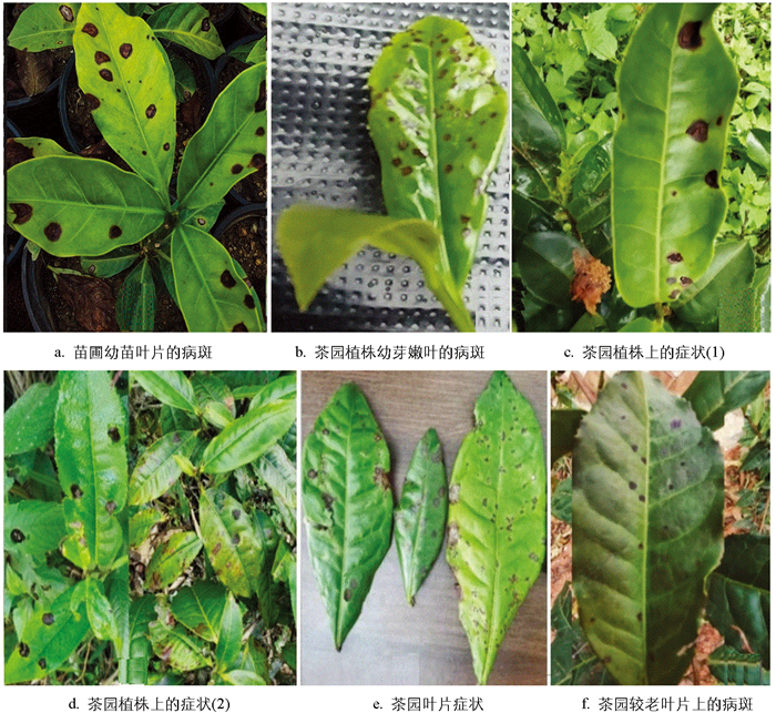 高粱附球孢是一种寄主范围较广的植物病原真菌,其冬季主要在寄主病叶组织内越冬,分生孢子随气流及雨水(水滴)溅射传播,浸染成叶引起发病,多在适温高湿的环境下快速传播[4, 24]。近年来的国内外文献记载有50余种植物病害是由高粱附球孢侵染所致,其中重要的有水稻叶斑病、玉米白斑病、麦类黑点病、玉米白斑病、高粱苗枯病和大豆叶枯病等[29-33],另外还有甘蔗、芋头、金针菜、火龙果、百合、七叶一枝花和牡丹等重要经济作物的叶斑病[34-40]。本研究结果表明高粱附球孢为茶褐斑病的病原菌。一般认为茶褐斑病的病原菌为一种尾孢属真菌(Cercospora sp.),主要危害茶树的成叶和老叶[4, 24],然而,笔者在各地调查时观察到茶树的幼苗、嫩芽和嫩叶发病也非常普遍,附球孢褐斑病叶片的病斑与文献中描述的褐斑也有较大差异,其更趋于黑褐色,这可能是由于引起褐斑病的病原菌种类不同所致;茶树幼芽和嫩叶受附球孢褐斑病的危害,对茶叶产量及品质的影响较老叶更为严重,因此在茶树的栽培管理中需要更加重视这种病害的防控。