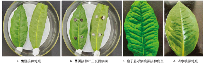 • 从两个不同地方茶园各采集具有典型症状的10片病叶,在PDA培养基平板上分离和纯化后共获得12个真菌纯培养菌株。离体叶片微刺伤接种试验确认有4个菌株能引起侵染发病,用菌饼分别接种48 h后叶组织软化呈水渍状,7 d后各菌株形成的病斑,与苗床幼苗上和潮湿气候条件下田间病茶叶上的病斑类似,接种叶片表面病斑呈圆形或椭圆形,中部颜色较浅呈灰褐色,边缘颜色较深呈黑褐色;病菌的菌丝生长穿透叶片组织,使叶片背面病斑几乎完全被灰白色的菌丝覆盖(图 2)。接种10 d后用灭菌接种针直接挑取叶片背面病斑上长出的菌丝体,置于PDA培养基平板中央,在(25±1) ℃培养箱中培养7 d后形成与原分离株形态相同的纯培养菌落。其他菌株在处理21 d后未见叶片发病,用PDA培养基块处理的对照叶片也一直保持健康状态。根据柯赫氏证病试验确认4个致病分离株(CYB01—CYB04)是引起茶树褐斑病的病原菌。