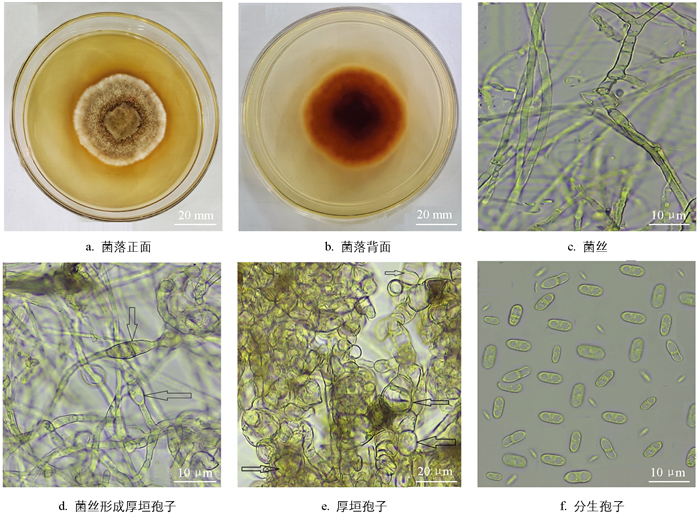 • 4个致病真菌菌株的形态没有明显区别,在PDA培养基平板(25±1) ℃下培养7 d后形成的菌落(图 3a3b)近圆形,表面绒毛状,呈灰黑和灰白色相间的同心轮纹,最外一环为浅灰白色,略呈波纹状,菌落周围的培养基变为浅褐色;菌落背面中部黑褐色,周围大部分红褐色,边缘环绕1圈白色菌丝,菌落呈近圆形,直径为53.1~76.8 mm(n=5),生长速率为9.7 mm/d。菌丝较发达,分隔,无色透明,直径为2.1~3.6 μm(n=30);后期菌丝变浅灰色,有的菌丝中部膨大(图 3c)形成厚垣孢子(图 3d)。厚垣孢子近椭圆形或棍棒状,不分隔或分1~2隔(图 3e),13.3~41.3 μm×8.4~13.3 μm(n=30)。分生孢子(图 3f)单细胞,无色或浅灰色,圆形或椭圆形,2.6~6.8 μm×1.8~4.2 μm(n=30)。本研究中未能见到病菌的分生孢子器及有性时期。结合病原菌特征并参考有关文献[21-23]将其初步确认为一种附球菌(Epicoccum sp.)。