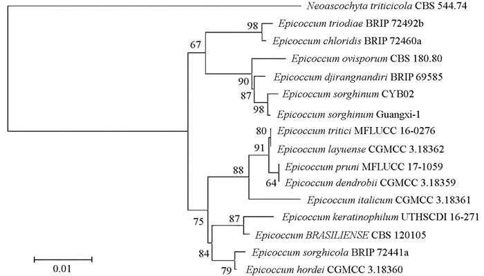 高粱附球孢在新近的细胞生物分类系统中属于真核域(Eukaryota)、真菌界(Fungi)、子囊菌门(Ascomycota)、盘菌亚门(Pezizomycotina)、座囊菌纲(Dothideomycetes)、格孢腔菌目(Pleosporales)、亚隔孢壳科(Didymellaceae)、附球孢属(Epicoccum)[28],其无性阶段属于真菌界(Fungi)、半知菌门(Dueteromycota)、腔孢纲(Coelomycetes)、球壳孢目(Sphaeropsidales)、壳霉科(Sphaeropsicaceae)、叶点霉属(Phyllosticta)。通常情况下该菌常见无性时期的分生孢子,而较难观察到其有性时期。在本研究中,笔者也未见到该菌的有性时期。