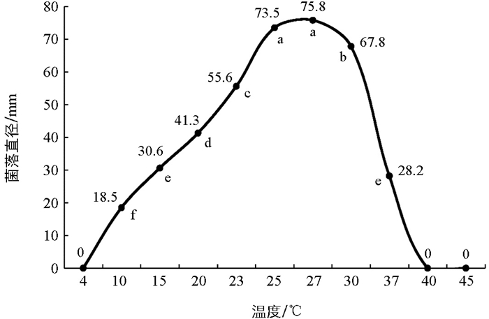 • 病原菌CYB02在16~33 ℃内都能正常生长(图 5),但在25~27 ℃下生长最快,培养7 d后菌落直径为73.5~75.8 mm(n=5),当培养温度低于4 ℃或高于40 ℃时,菌落停止生长。由此可见,CYB02生长的最适温度为25~27 ℃。
