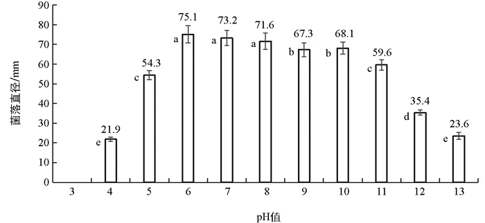 2) 酸碱度试验  用PDA培养基平板,设置pH值为4、5、6、7、8、9、10、11、12、13,用1.0 mol的HCl溶液和1.0 mol的NaOH溶液调节培养基的酸碱度至所需pH值,每个处理重复5次。