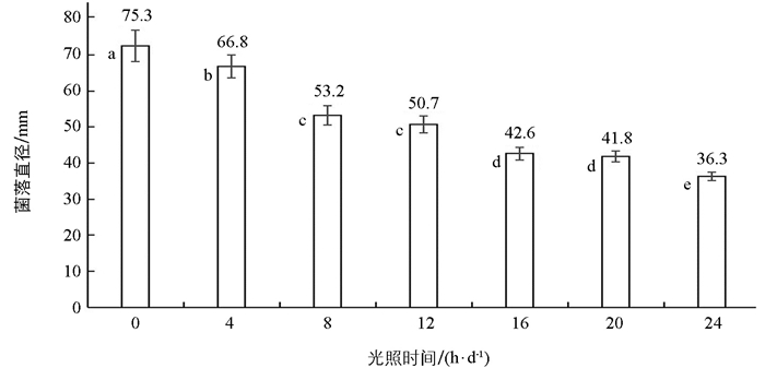 • 经0~24 h/d光照处理后CYB02的菌落均能正常生长,但不同处理之间的菌落大小存在明显差异(图 7)。培养7 d后,完全黑暗(0 h/d)处理的菌落生长最好,直径最大,为75.3 ±4.8 mm(n=5);短光照(4 h/d)与较长光照处理(8~24 h/d)的菌落直径之间差异有统计学意义(p<0.05),且每天的光照时间越长,菌落生长越缓慢,因此,CYB02最适合在黑暗条件下培养。