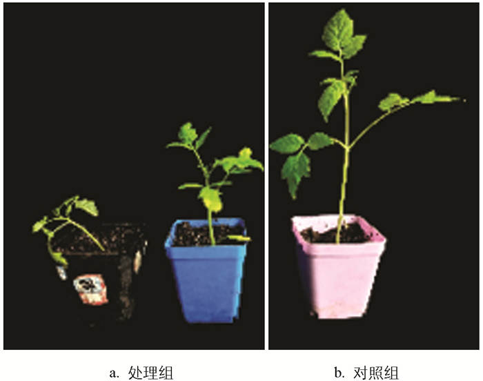 • 从患病番茄根部分离出1株病原菌,将其回接到番茄根部,7 d后发现对照组长势明显好于处理组(图 1)。从表现出典型病症的植株中重新分离出病原菌,获得生长性状与原始分离到的病原菌一致的培养物,证明原培养物是番茄根腐病的病原菌。