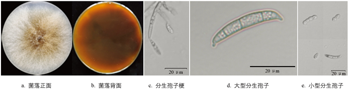 • 结果表明:病原菌在PDA培养基上生长迅速,7 d可长满全皿,菌落呈白色绒毛状,气生菌丝较为发达,生长后期产生黄褐色色素(图 2a2b)。光学显微镜下观察产孢情况,发现在PDA培养基上产孢较丰富,分生孢子梗多分枝(图 2c)。大型分生孢子呈月牙形,孢子较弯曲,有3~6隔,约20~40 μm(图 2d);小型分生孢子呈卵圆形,有或无隔,约10~25 μm(图 2e)。