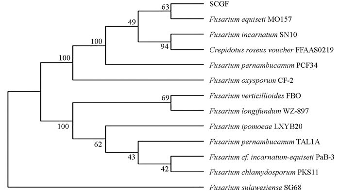 • 将测序结果在NCBI上比对,显示ITS基因序列与木贼镰孢菌(F. equiseti)有较高的相似度。基于ITS基因序列用NJ法进行联合建树,结果显示根腐病病原菌(SCGF)与木贼镰孢菌(F. equiseti)聚在一支(图 3),确定该地区番茄根腐病的致病菌为木贼镰孢菌(F. equiseti)。