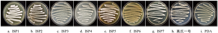 • 培养特征观察:将生防菌SC-6分别划线接种于ISP1-ISP7、高氏一号、PDA等培养基上,28 ℃恒温培养7 d,观察并记录生防菌株在9种培养基中菌丝是否生长良好、气生菌丝颜色、基内菌丝颜色及可溶性色素的颜色。