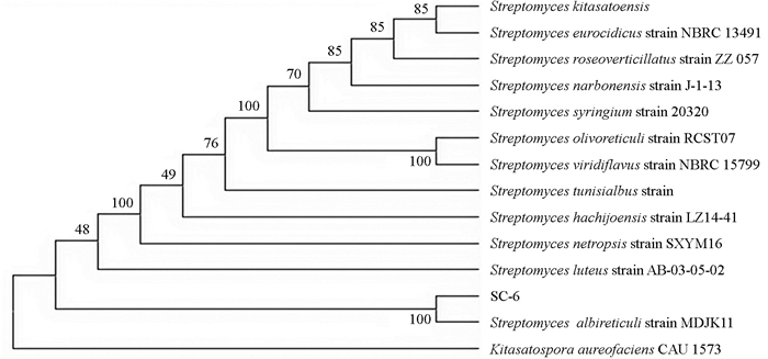 • 将测序结果在NCBI上比对,结果显示,菌株序列与白网链霉菌(Streptomyces albireticuli)有较高的相似度。基于16S rDNA基因序列构建系统发育树,结果显示SC-6与白网链霉菌(S. albireticuli)聚在一支上(图 6)。经形态学和分子生物学鉴定,将SC-6鉴定为白网链霉菌(S. albireticuli)。