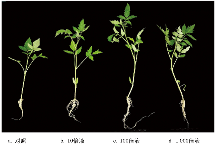 • 表 4可知,生防菌株SC-6发酵液对番茄幼苗生物量的影响由大到小依次为100倍液、1 000倍液、10倍液。整体上看,生防菌株SC-6发酵液处理后的番茄幼苗相关生长性状明显优于对照处理,说明该菌能够促进番茄幼苗的生长,其中100倍液处理过的幼苗生长优于其他处理,即生防菌株SC-6发酵液100倍液的促生效果最好(图 7),其株高、根长、地上鲜质量和地下鲜质量分别增加了60.41%、81.84%、176.19%和42.22%。