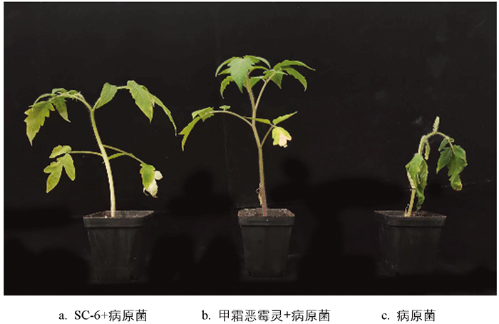 • 盆栽试验结果表明,生防菌株SC-6和化学药剂(甲霜恶霉灵)处理均可显著降低番茄根腐病的病情指数及发病率,其中SC-6处理后的防效为50.02%,接近化学防效(图 8表 5)。