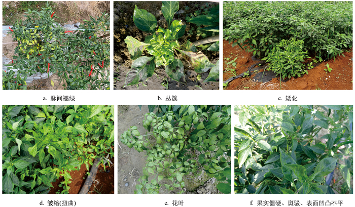 • 病毒病在海南辣椒主要种植区均有不同程度的发生,长期连作种植区发生率普遍高于新种植区。感染病毒病的辣椒在田间表现出多种症状,如叶片出现褪绿、丛簇、矮化、皱缩(扭曲)、花叶等症状,果实僵硬、斑驳、表面凹凸不平等(图 1)。