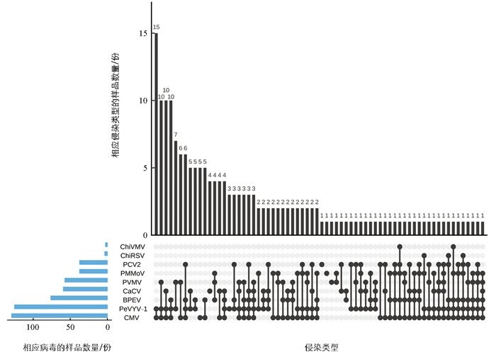 在检测到病毒的178份样品中,仅15份样品为单一病毒侵染,其余样品为2~6种病毒复合侵染,复合侵染率为91.57%,有62种复合侵染类型(图 2),其中2种、3种、4种、5种和6种病毒复合侵染检出率分别为31.46%、29.21%、20.79%、7.87%和2.24%,说明海南一年生辣椒上病毒复合侵染现象严重,以2~4种病毒复合侵染为主。