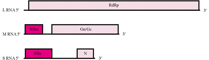 • CaCV-WC24的L、M、S RNA的基因组长度分别为8 913 nt,4 840 nt和3 629 nt,GenBank登录号分别为PQ793445、PQ793446和PQ793447。CaCV-WC24的基因组结构见图 3,L RNA为负义,在互补链上含有1个开放阅读框(open reading frame,ORF),编码依赖于RNA聚合酶RdRp(248~8 881 nt,2 877 aa),分子量为331.20 kDa。M RNA为双义,含有2个ORFs,病毒链编码非结构蛋白NSm(58~984 nt,308 aa),分子量为34.32 kDa;互补链编码糖蛋白前体Gn/Gc(1 428~4 793 nt,1 121 aa),分子量为127.57 kDa。S RNA为双义,含有2个ORFs,病毒链编码非结构蛋白NSs(67~1 386 nt,439 aa),分子量为49.74 kDa;互补链编码核衣壳蛋白N(2 735~3 562 nt,275 aa),分子量为30.74 kDa。