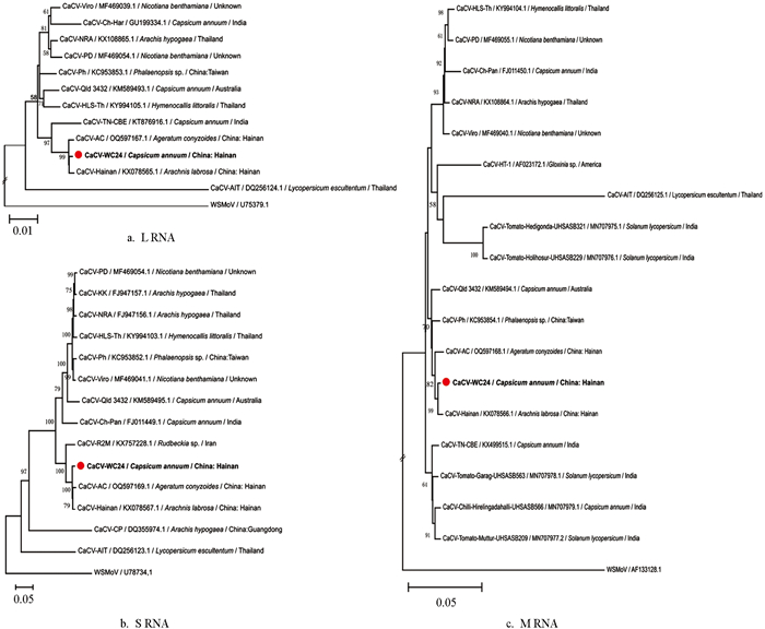 Blastn比对显示,CaCV-WC24的L、M、S RNA基因组序列均与海南蜘蛛兰分离物(CaCV-Hainan)和藿香蓟分离物(CaCV-AC)的相似性最高(98.21%~99.27%),与其他CaCV分离物的相似性分别为83.98%~95.88%、92.21%~98.12%,87.80%~94.02%。CaCV-WC24的RdRp、NSm、Gn/Gc、NSsN与已知CaCV分离物相对应基因的氨基酸序列相似性分别为93.67%~99.44%、91.56%~100.00%、91.44%~99.29%、87.93%~98.63%和94.91%~99.64%。