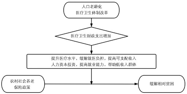 第七次人口普查数据表明,中国60岁及以上的老年人数已超全国人口总数的18%,人口老龄化是目前我国社会不可忽视的问题,提高农村老年人可支配收入的农村社会养老保险政策是有效应对人口老龄化的重要政策。农村是我国人口老龄化程度最严重的地区,这会增加有关医疗卫生方面的需求与支出,增加医疗卫生资源对农村地区的供给。一方面,医疗卫生财政支出的增加,能够优化医疗资源的空间分布,提高乡镇医疗服务质量,降低农民异地就医的成本,减轻其就医负担,间接地增加农村居民在其他方面的可支配收入,并通过加快基本公共服务均等化缩小城乡差距[25],缓解相对贫困;另一方面,医疗卫生财政支出的增加本质上是国家对劳动者的健康和人力投资,有利于促进农户减贫[26],且医疗卫生财政支出对农村居民收入增幅作用显著[27],能提升农村地区低收入群体的“造血”能力,缓解农村低收入群体的相对贫困状态。故引入医疗卫生财政支出为调节变量,对假说H1与H2进行调节效应分析,提出如下研究假说H5和H6,理论框架如图 3所示: