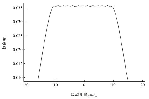 采用断点回归模型进行分析要求断点周围无明显人为操控,已有文献大多通过观测断点两边样本分布的均匀程度进行说明。对616个样本做核密度检验,如图 4所示,驱动变量year_在断点0左右的核密度分布较为均匀,并无明显操纵,检验通过。