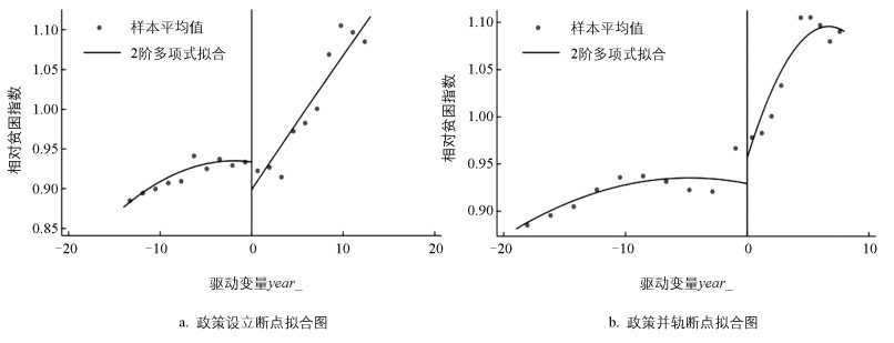 对第二个断点(2014年)进行同样操作,选择二次多项式拟合的方法进行检验,并汇报检验得到的处理效应的p值。政策并轨断点拟合检验结果显示,p值为0.822,不在p=0.1的显著性水平上,满足假说前提。按照驱动变量值平均分割进行多项式拟合画图,如图 5b所示,在year_=0处(即2014年),被解释变量相对贫困指数有明显跳跃,故认定该解释(驱动)变量存在断点,且为农村社会养老保险政策并轨的年份2014年。