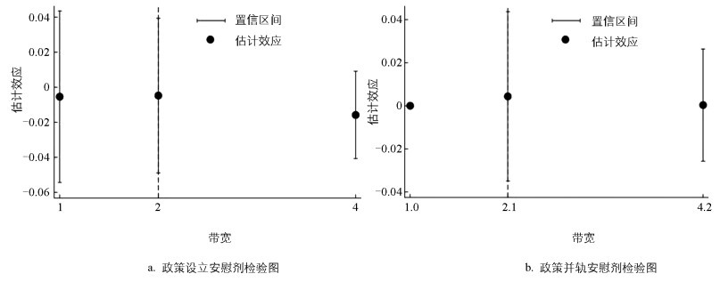 带宽长短对回归分析的效果有较大影响,要取得较好的效果,就必须要求带宽的敏感度较小。根据现有研究做法,分别根据最优带宽的0.5倍、1倍、2倍进行局部线性回归,并绘制局部线性回归图,以检验断点回归估计量对带宽的依赖。分别对本研究设定的设立与并轨断点进行检验,结果如图 6所示。回归结果基本保持一致且显著,说明结果较为可靠。
