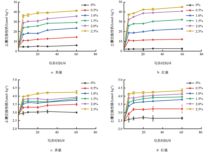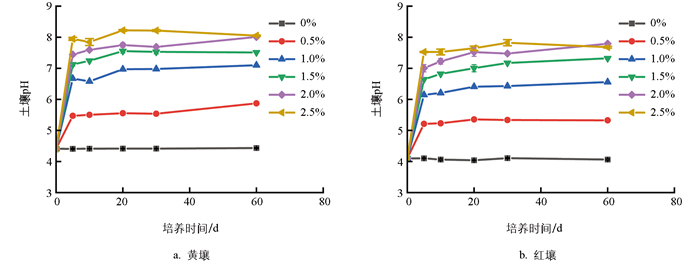 土壤活性酸度以pH值表示,是反映土壤酸度的强度因素,pH值越低,表明土壤活性酸度越强。由图 1可知,施用硅钙镁调理剂可快速提升两种土壤的pH值,施用5 d即可使土壤pH值发生显著变化,并在60 d的培养时间内使pH值基本保持稳定。到培养结束时,与不施调理剂的对照相比,施用0.5%、1.0%、1.5%、2.0%和2.5%的调理剂使黄壤的pH值分别提高1.44、2.67、3.08、3.58和3.62个单位,增幅分别为32.5%、60.2%、69.4%、80.7%和81.6%,使红壤pH值分别提高1.26、2.50、3.26、3.73和3.62个单位,增幅分别为31.1%、61.4%、80.2%、91.8%和89.0%。