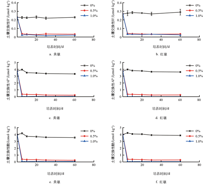 土壤潜性酸度用交换性酸表示,包括交换性H+和交换性Al3+,反映土壤酸度的容量因素。当硅钙镁调理剂用量高于1.0%时,由于两种土壤的交换性酸总量极低,因此主要测定调理剂用量≤1.0%时交换性酸的变化(图 2)。不施调理剂时,两种土壤的交换性Al3+含量明显高于交换性H+。施入调理剂5 d后,两种土壤的交换性H+、Al3+含量大幅度降低,并在之后基本稳定不变。与对照相比,调理剂施入60 d后,0.5%和1.0%调理剂处理的黄壤交换性酸总量分别降低至0.24 cmol/kg和0.08 cmol/kg,下降幅度分别为93%和98%;红壤的交换性酸总量分别下降至0.29 cmol/kg和0.05 cmol/kg,下降幅度分别为93%和99%。
