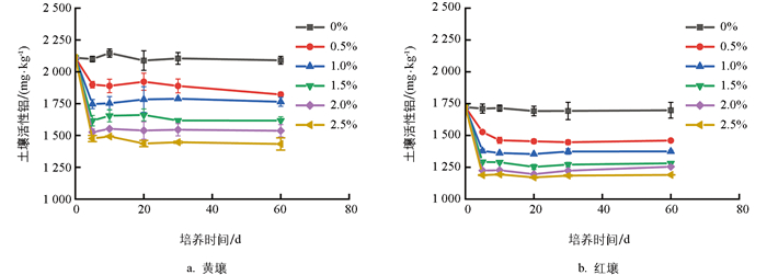 土壤活性铝含量与土壤酸度密切相关。从图 3可知,不施调理剂时,黄壤和红壤的活性铝含量分别保持在2 106.93 mg/kg和1 705.16 mg/kg左右。施入硅钙镁调理剂5 d后,两种土壤的活性铝含量明显下降,且调理剂用量越高活性铝含量越低,此后活性铝含量都保持较为稳定。到培养60 d时,与对照相比,0.5%、1.0%、1.5%、2.0%、2.5%调理剂处理下黄壤的活性铝含量下降幅度分别为12.9%、15.6%、22.7%、26.5%和31.4%,红壤的活性铝含量下降幅度分别为14.0%、19.1%、24.5%、26.1%和29.9%。