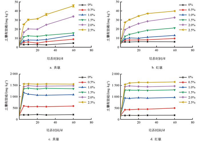 硅钙镁土壤调理剂施用能显著提高黄壤和红壤的有效磷和有效硅含量,调理剂施用量越大,有效磷和有效硅含量越高,且促进有效磷释放的后效较长(图 5)。施入调理剂5 d后,与对照相比,0.5%、1.0%、1.5%、2.0%和2.5%调理剂处理分别使黄壤有效磷含量增加到5.42、7.06、11.39、16.50和25.23 mg/kg,使红壤有效磷含量分别增加到7.73、9.07、12.03、19.34和27.49 mg/kg。此后,施用调理剂的土壤有效磷含量整体随培养时间增加而持续升高,到培养结束时黄壤有效磷含量分别增至8.83、13.27、15.63、33.94和45.62 mg/kg,红壤有效磷含量分别增至9.65、13.04、21.26、32.72和39.94 mg/kg。同样,有效硅含量在施入调理剂5 d后迅速提升,此后保持相对稳定水平。培养60 d后,与不施调理剂相比,0.5%、1.0%、1.5%、2.0%和2.5% 处理黄壤有效硅含量分别升高至594.05、1 117.21、1 351.49、1 445.92和1 567.37 mg/kg,红壤有效硅含量分别升高到425.97、942.58、1 291.35、1 447.23和1 543.76 mg/kg。
