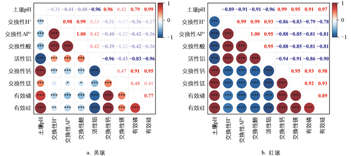 相关性分析结果表明,黄壤与红壤的土壤酸度及养分含量指标之间存在显著关联。在黄壤中(图 6a),土壤pH值与活性铝含量呈极显著负相关(r=-0.96,p<0.001),而与交换性钙(r=0.96,p<0.001)、有效硅(r=0.99,p<0.001)及有效磷(r=0.79,p<0.001)呈极显著正相关;活性铝则与交换性酸总量显著正相关(r=0.42,p<0.001),与交换性钙(r=-0.96,p<0.001)、有效磷(-0.83,p<0.001)和有效硅(-0.96,p<0.001)呈极显著负相关。在红壤中(图 6b),土壤pH值与交换性酸(r=-0.91,p<0.001)及活性铝(r=-0.96,p<0.001)呈极显著负相关,而与交换性钙(r=0.99,p<0.001)、交换性镁(r=0.95,p<0.001)、有效磷(r=0.91,p<0.001)和有效硅(r=0.97,p<0.001)呈极显著正相关。综合分析表明,在两种土壤中,土壤pH值的升高均有助于降低交换性酸与活性铝含量,同时促进交换性钙、交换性镁、有效磷和有效硅含量,从而缓解铝毒胁迫并改善土壤养分状况。值得注意的是,黄壤与红壤在主要酸度及养分指标间的相关趋势基本一致,反映出硅钙镁调理剂对两类酸性土壤化学性质的改良机制具有普遍性与规律性。