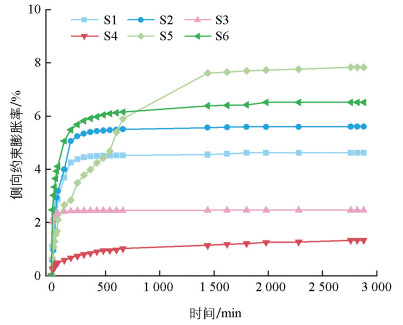 图 2  侧向约束膨胀率与时间的关系曲线