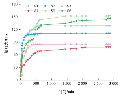 • 红层泥岩膨胀力与时间的关系如图 3所示,红层泥岩膨胀力平均值为119.08 kPa,岩样S1-S6膨胀稳定后的岩石膨胀力分别为129.29 kPa、111.11 kPa、85.63 kPa、78.35 kPa、153.69 kPa、146.40 kPa。与膨胀率试验结果相同,内江沙溪庙组岩样的膨胀力大于南充遂宁组及南充沙溪庙组,稳定状态下膨胀力关系为S5>S6>S1>S2>S3>S4。膨胀力试验结果从指数型增长发展至增长稳定,整个膨胀过程均呈三段式膨胀阶段,岩样S1-S6进入岩石膨胀压力稳定的时间分别为17 h、10 h、16 h、30 h、33 h、47 h。但S5和S6在缓慢膨胀阶段发生明显跃升现象,且这2组岩样达到膨胀稳定的时间较长。